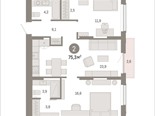 общая 75,34 м2, жилая 28,45 м2, кухни 23,85 м2 |