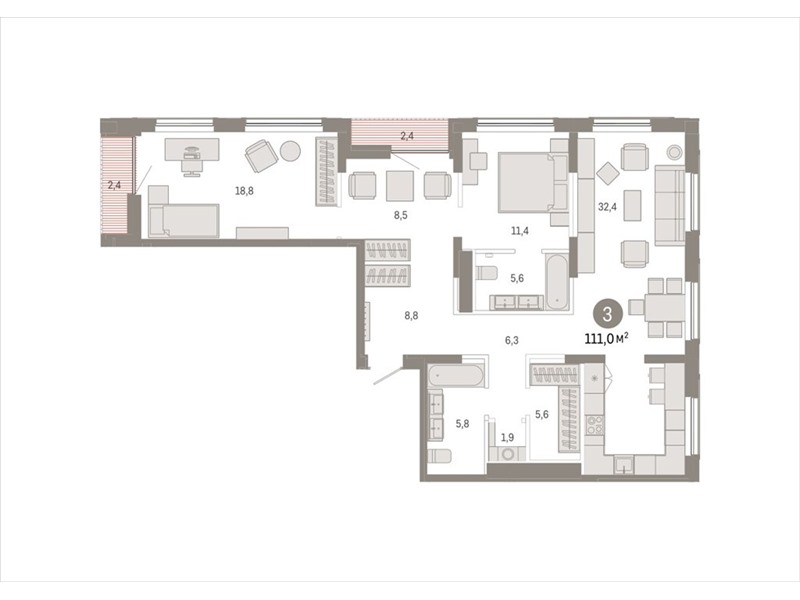 общая 110,98 м2, жилая 38,71 м2, кухни 32,43 м2 |