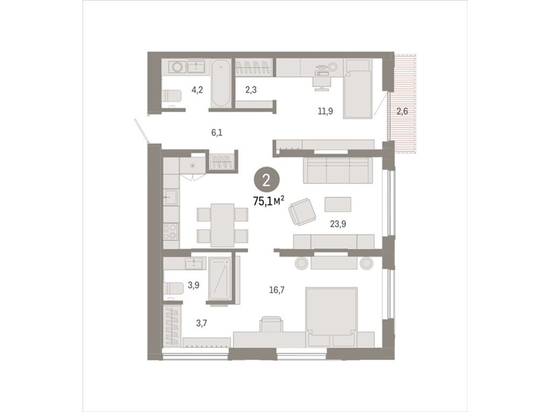 Квартира с кухней-гостиной и двумя спальнями в Октябрьском на Туре. Особенности планировки: вид во двор, разнесённые спальни, предчистовая отделка, мастер-спальня, балкон.