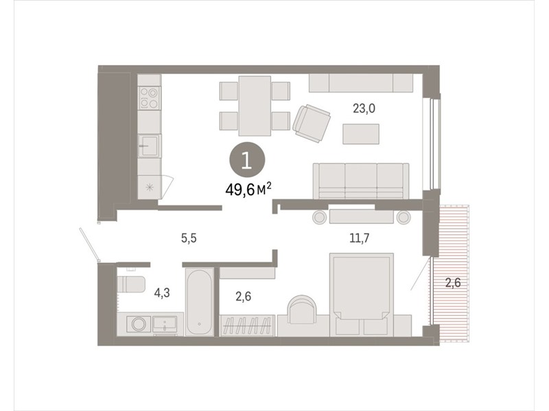 Квартира с кухней-гостиной и одной спальней в Октябрьском на Туре. Особенности планировки: вид во двор, предчистовая отделка, балкон.