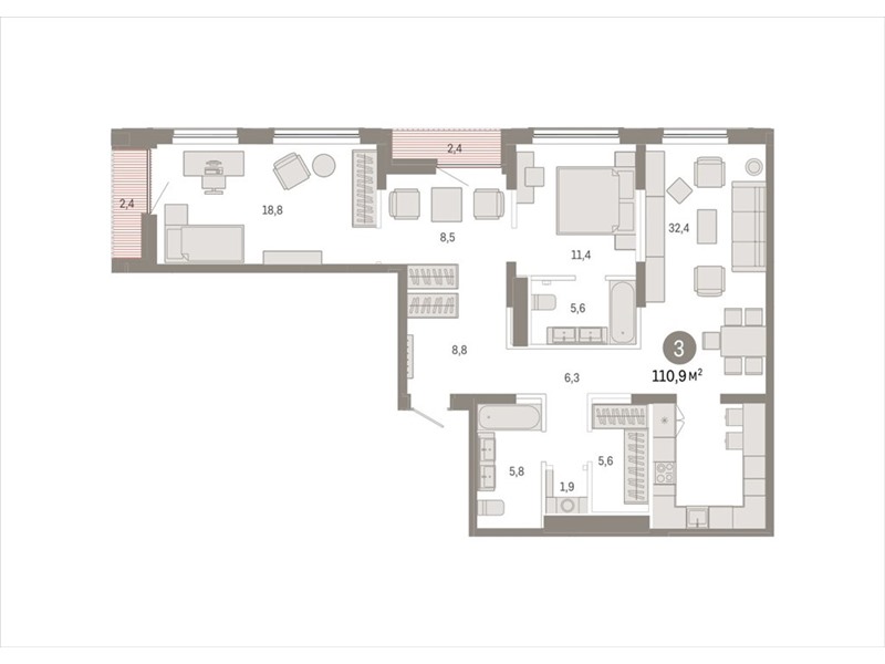 общая 110,93 м2, жилая 38,66 м2, кухни 32,43 м2 |