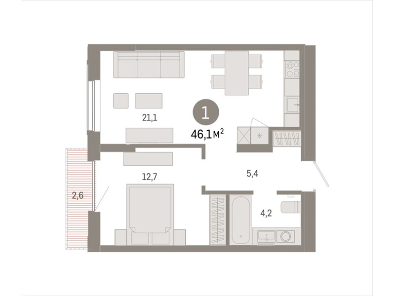 Квартира с кухней-гостиной и одной спальней в Октябрьском на Туре. Особенности планировки: предчистовая отделка, балкон.