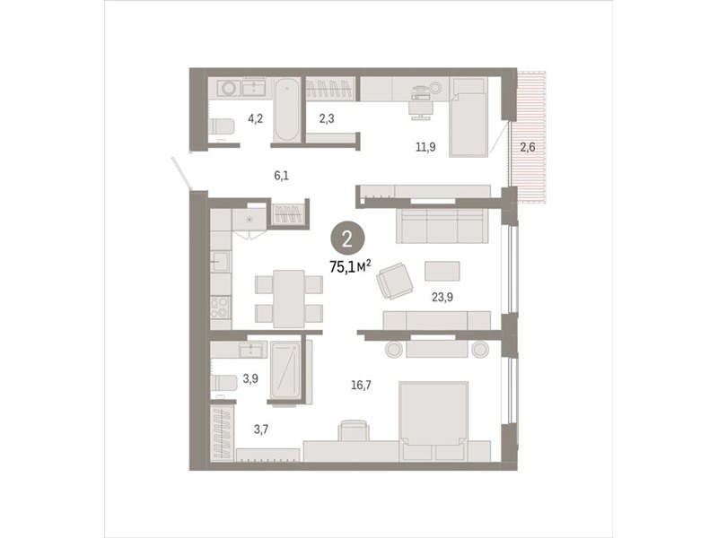 Квартира с кухней-гостиной и двумя спальнями в Октябрьском на Туре. Особенности планировки: вид во двор, разнесённые спальни, предчистовая отделка, мастер-спальня, балкон.