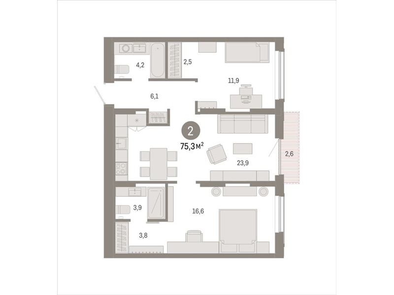 Квартира с кухней-гостиной и двумя спальнями в Октябрьском на Туре. Особенности планировки: вид во двор, разнесённые спальни, предчистовая отделка, мастер-спальня, балкон.