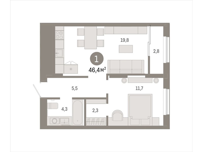 Квартира с кухней-гостиной и одной спальней в Октябрьском на Туре. Особенности планировки: вид во двор, тёплая лоджия, предчистовая отделка.
