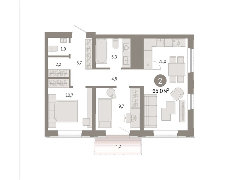 Квартира с кухней-гостиной и двумя спальнями в Октябрьском на Туре. Особенности планировки: второй санузел, гардеробная, вид во двор, предчистовая отделка, балкон.