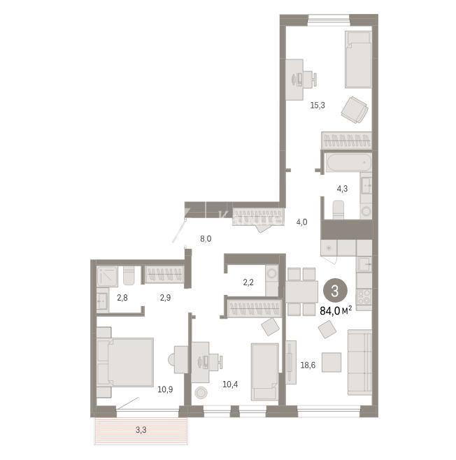 общая 84 м2, жилая 39,3 м2, кухни 18,6 м2 |