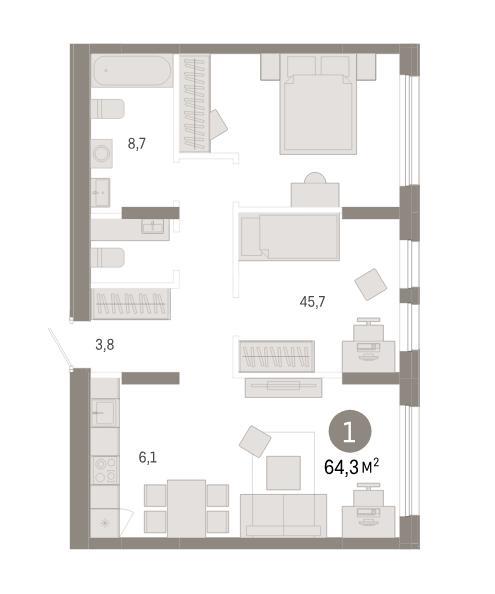 Квартира расположена на 8 этаже 9-этажного дома. Она имеет общую площадь 64,3 квадратных метра, что позволяет создать уютное пространство для жизни. Площадь кухни составляет 21 квадратный метр — это прекрасное место для семейных ужинов и дружеских посиделок.<br />