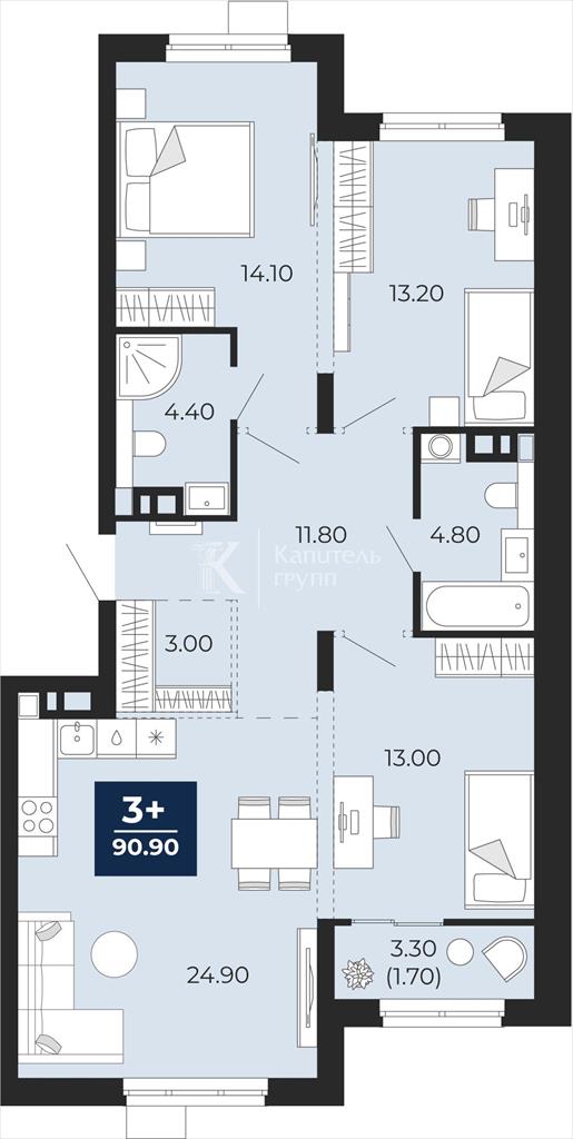 Продаётся квартира формата 3+ площадью 91 м² в жилом комплексе «Айвазовский». Окна выходят на две стороны, с 11 этажа открывается прекрасный вид. Во дворе располагается современный детский сад для жителей «Айвазовского». Уникальный проект отмечен на федеральных архитектурных выставках.<br />