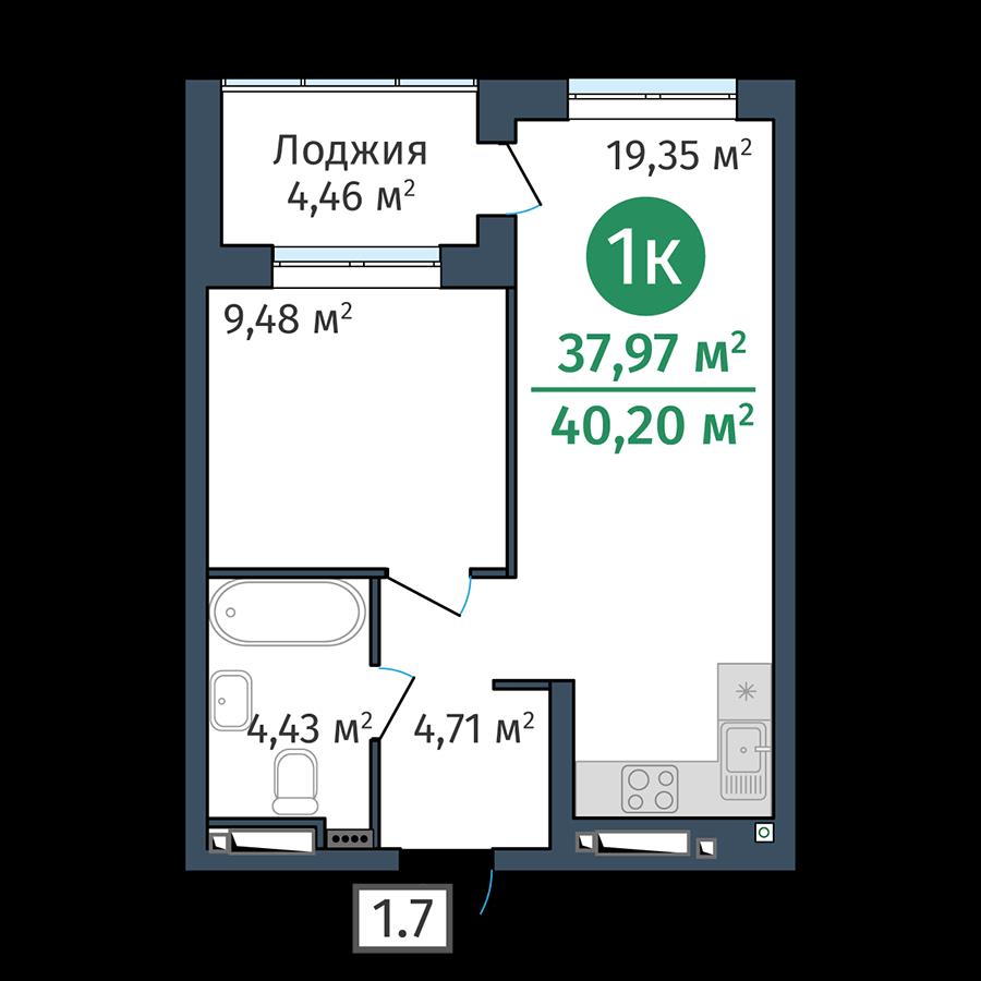 общая 37,97 м2, жилая 0 м2, кухни 19,35 м2 |