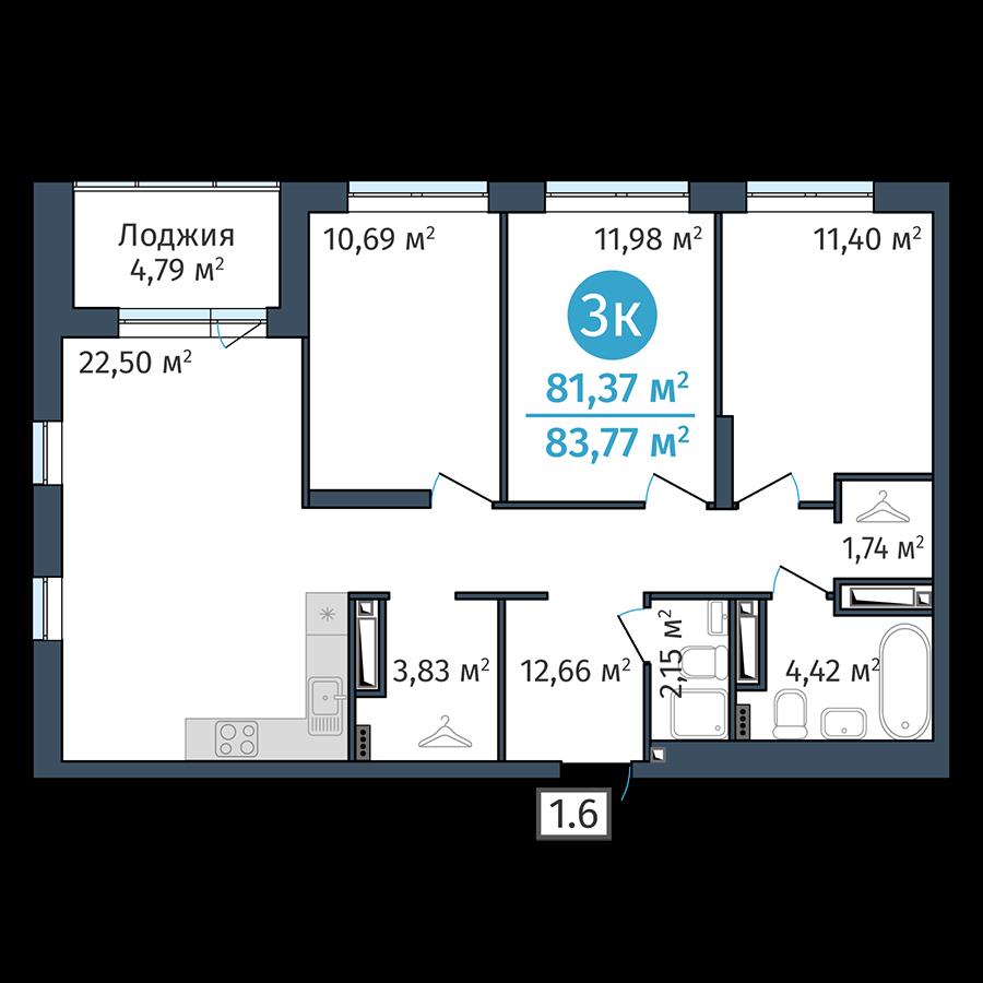 общая 81,37 м2, жилая 0 м2, кухни 22,5 м2 |