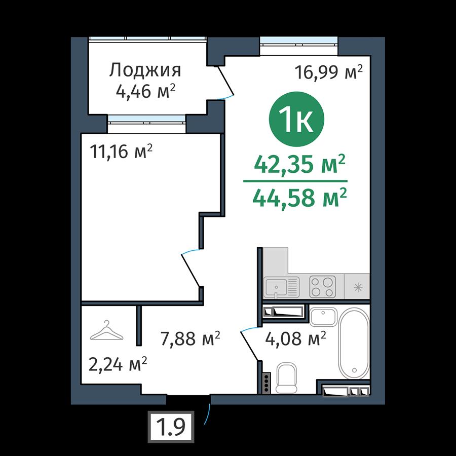 общая 42,35 м2, жилая 0 м2, кухни 16,99 м2 |