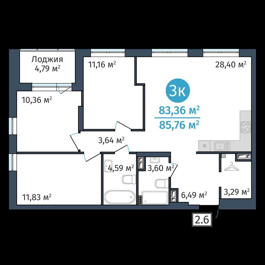 общая 83,36 м2, жилая 0 м2, кухни 28,4 м2 |