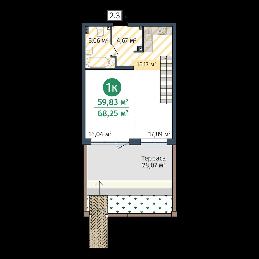 общая 59,83 м2, жилая 0 м2, кухни 17,89 м2 |