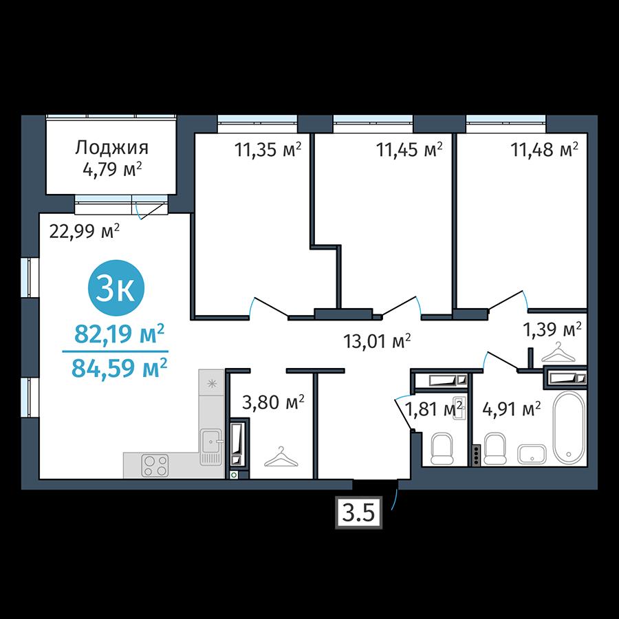 общая 82,19 м2, жилая 0 м2, кухни 22,99 м2 |