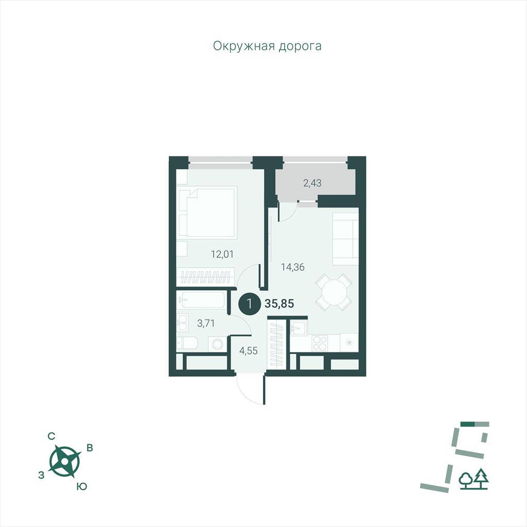 общая 35,85 м2, жилая 12,01 м2, кухни 0 м2 |