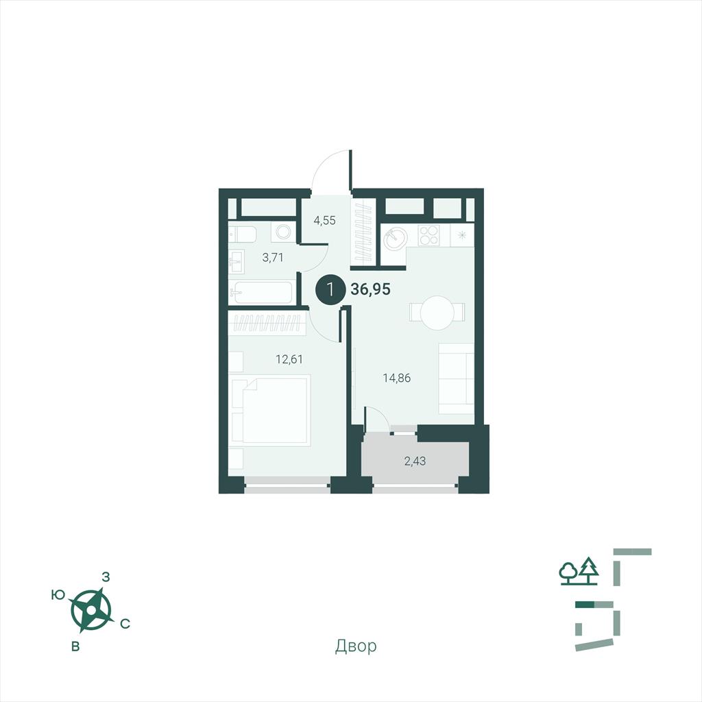 общая 36,95 м2, жилая 12,61 м2, кухни 0 м2 |