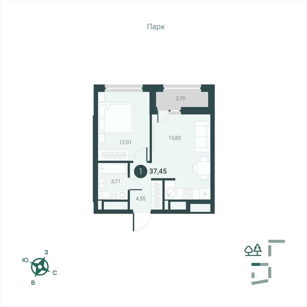 общая 37,45 м2, жилая 12,01 м2, кухни 0 м2 |