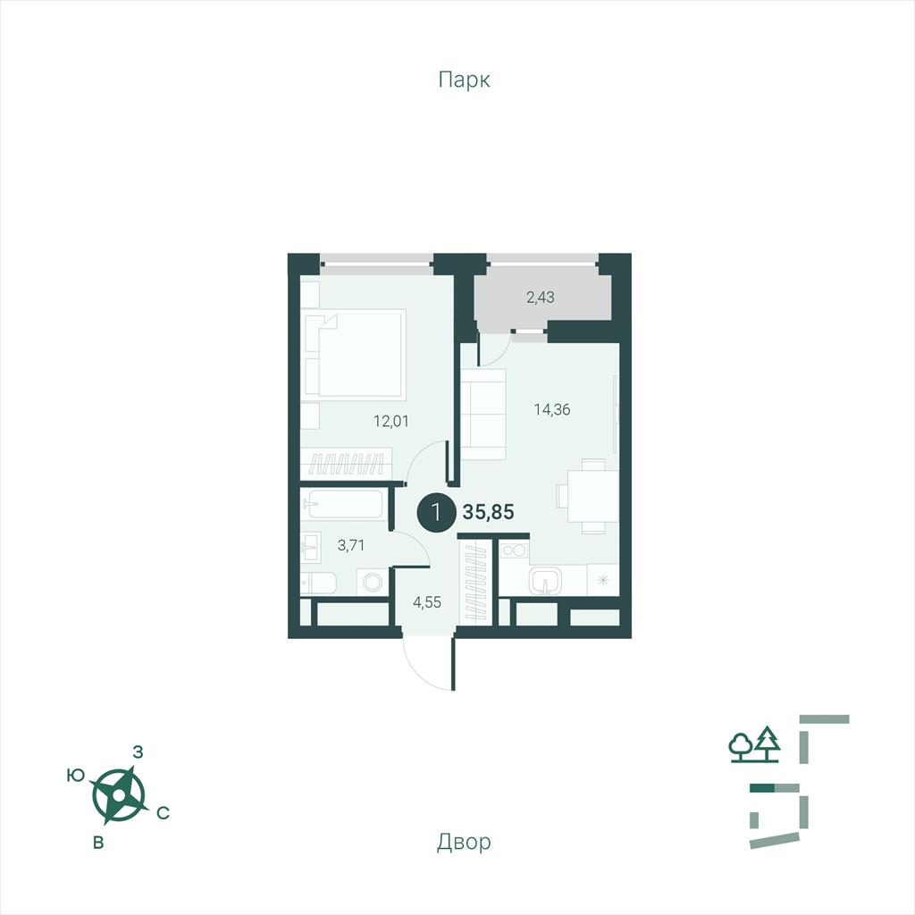 общая 35,85 м2, жилая 12,01 м2, кухни 0 м2 |