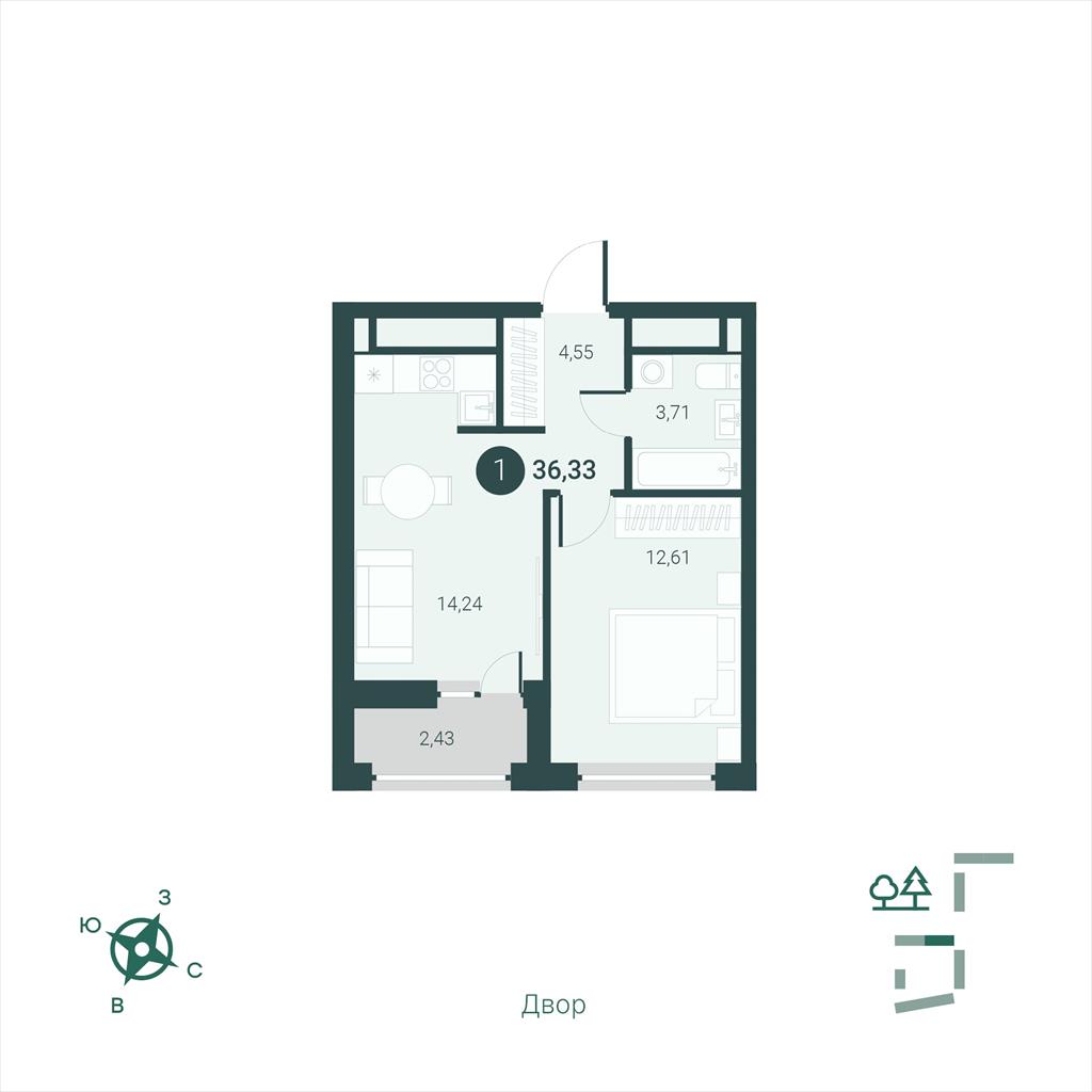 общая 36,33 м2, жилая 12,61 м2, кухни 0 м2 |