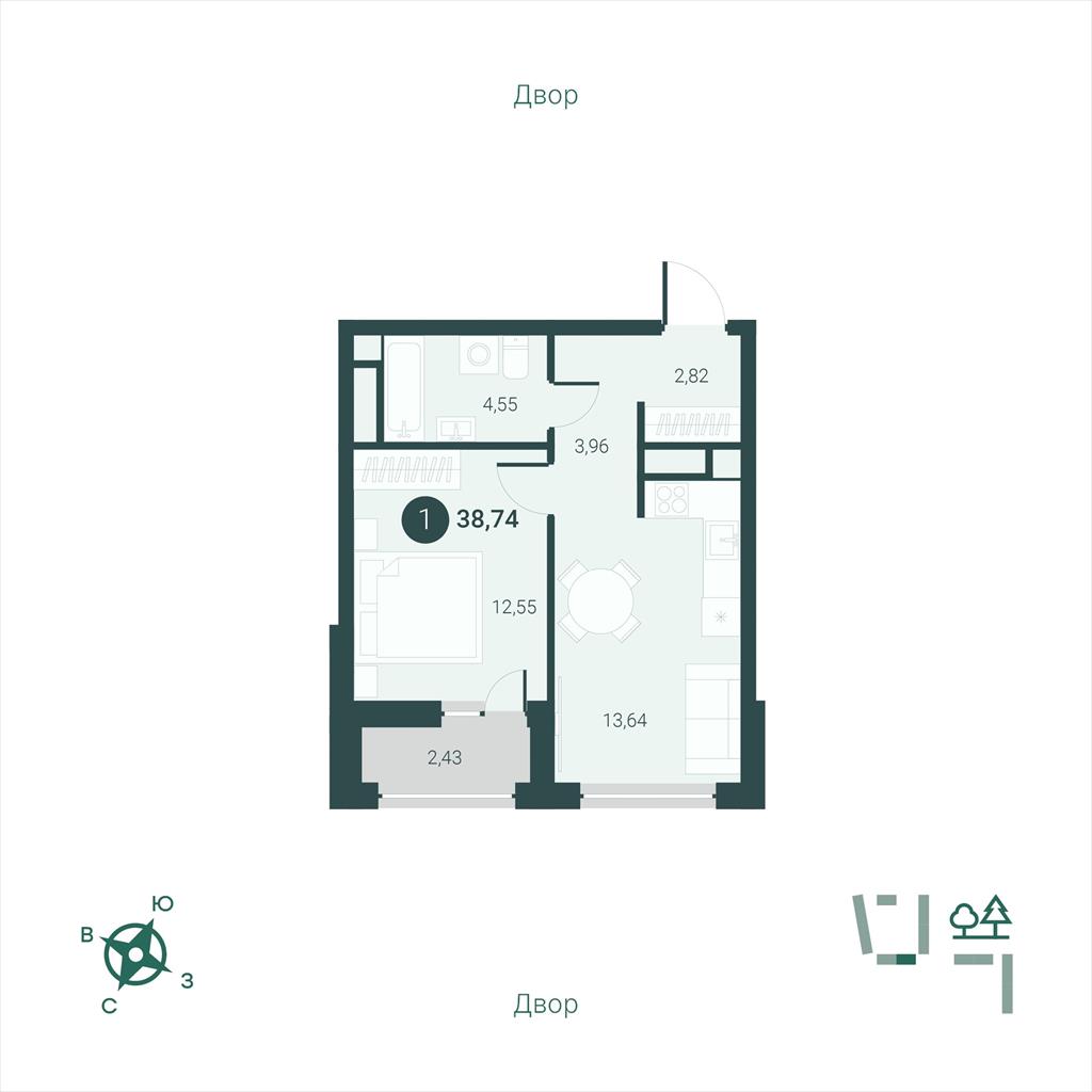 общая 38,74 м2, жилая 12,55 м2, кухни 0 м2 |