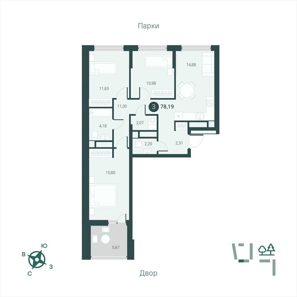 общая 78,19 м2, жилая 38,41 м2, кухни 0 м2 |