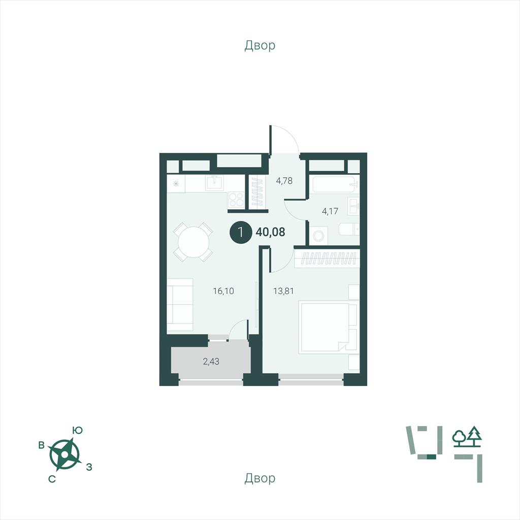общая 40,08 м2, жилая 13,81 м2, кухни 0 м2 |