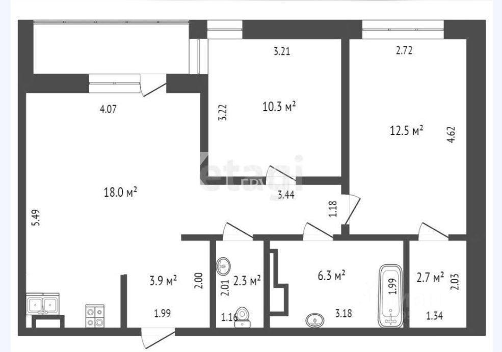 Представляем вашему вниманию просторную и светлую квартиру . Здесь есть всё для комфортной жизни: две комнаты, большая кухня-гостиная, два санузла и гардеробная. Общая площадь квартиры — 60,3 м², площадь кухни — 18 м².<br />