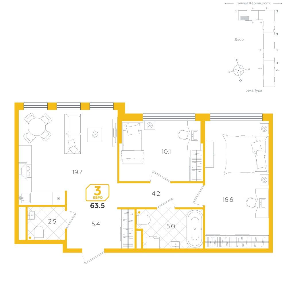общая 63,5 м2, жилая 26,7 м2, кухни 19,7 м2 |