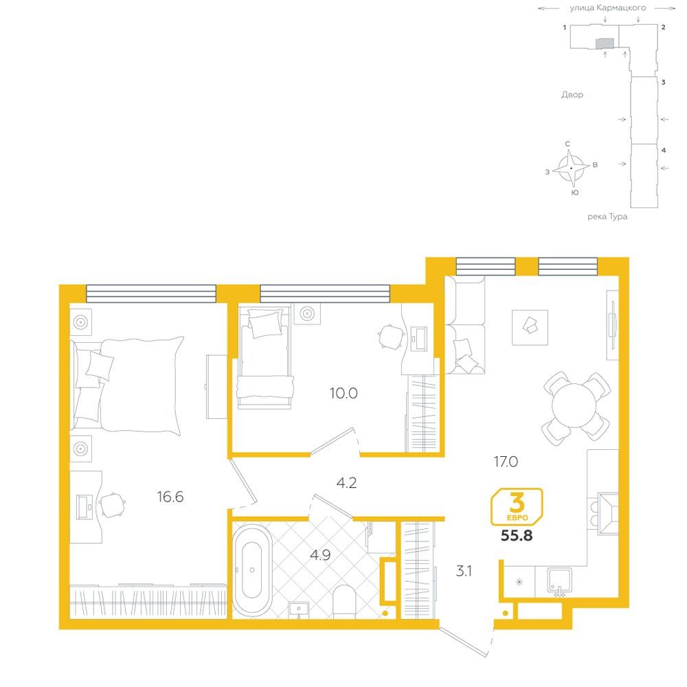 общая 55,8 м2, жилая 26,6 м2, кухни 17 м2 |