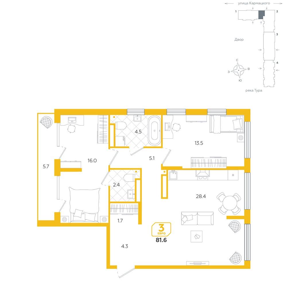 общая 81,6 м2, жилая 29,5 м2, кухни 28,4 м2 |
