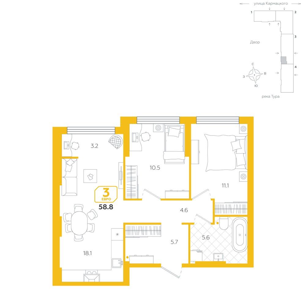 общая 58,8 м2, жилая 21,6 м2, кухни 18,1 м2 |