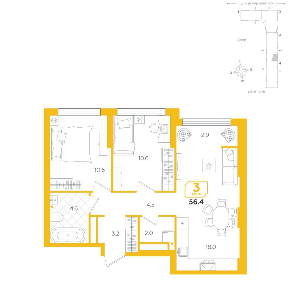 общая 56,4 м2, жилая 21,2 м2, кухни 18 м2 |