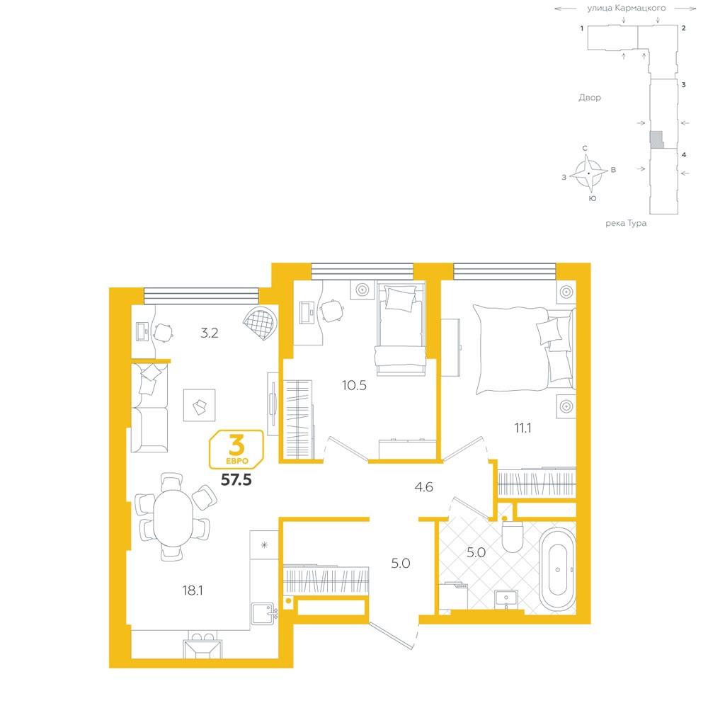 общая 57,5 м2, жилая 21,6 м2, кухни 18,1 м2 |