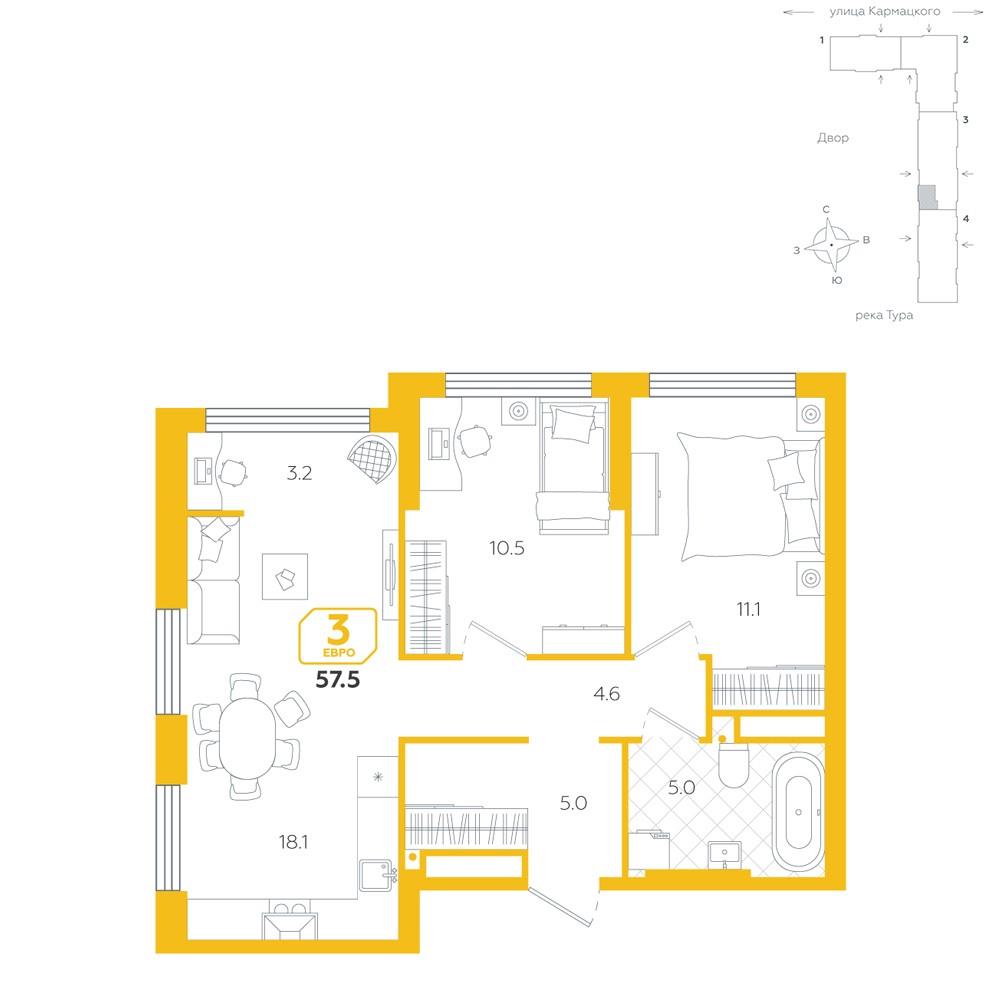 общая 57,5 м2, жилая 21,6 м2, кухни 18,1 м2 |