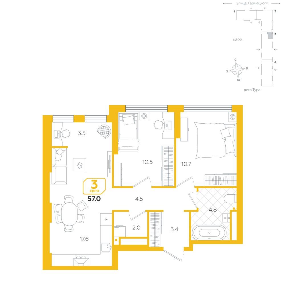 общая 57 м2, жилая 21,2 м2, кухни 17,6 м2 |