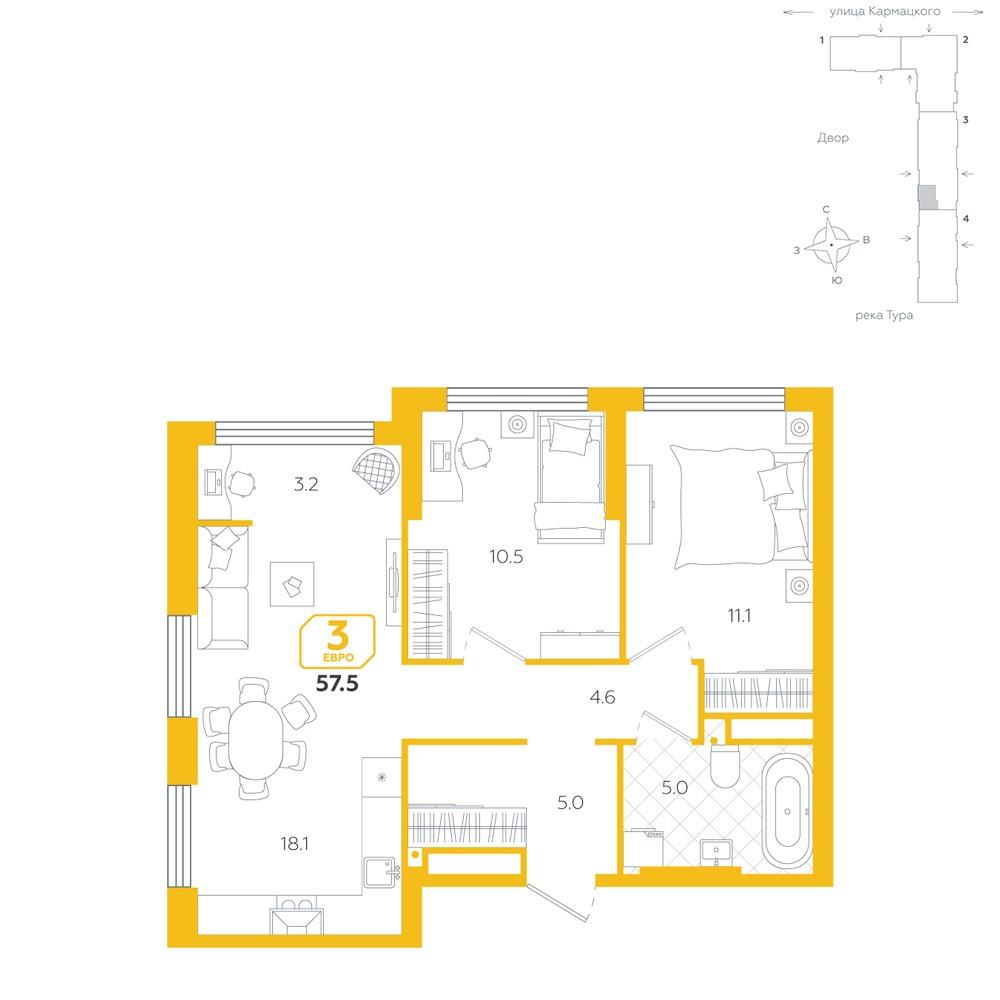 общая 57,5 м2, жилая 21,6 м2, кухни 18,1 м2 |