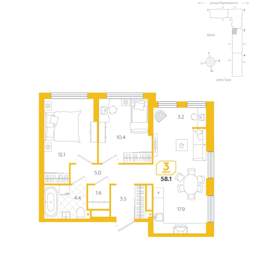 общая 58,1 м2, жилая 22,4 м2, кухни 17,9 м2 |