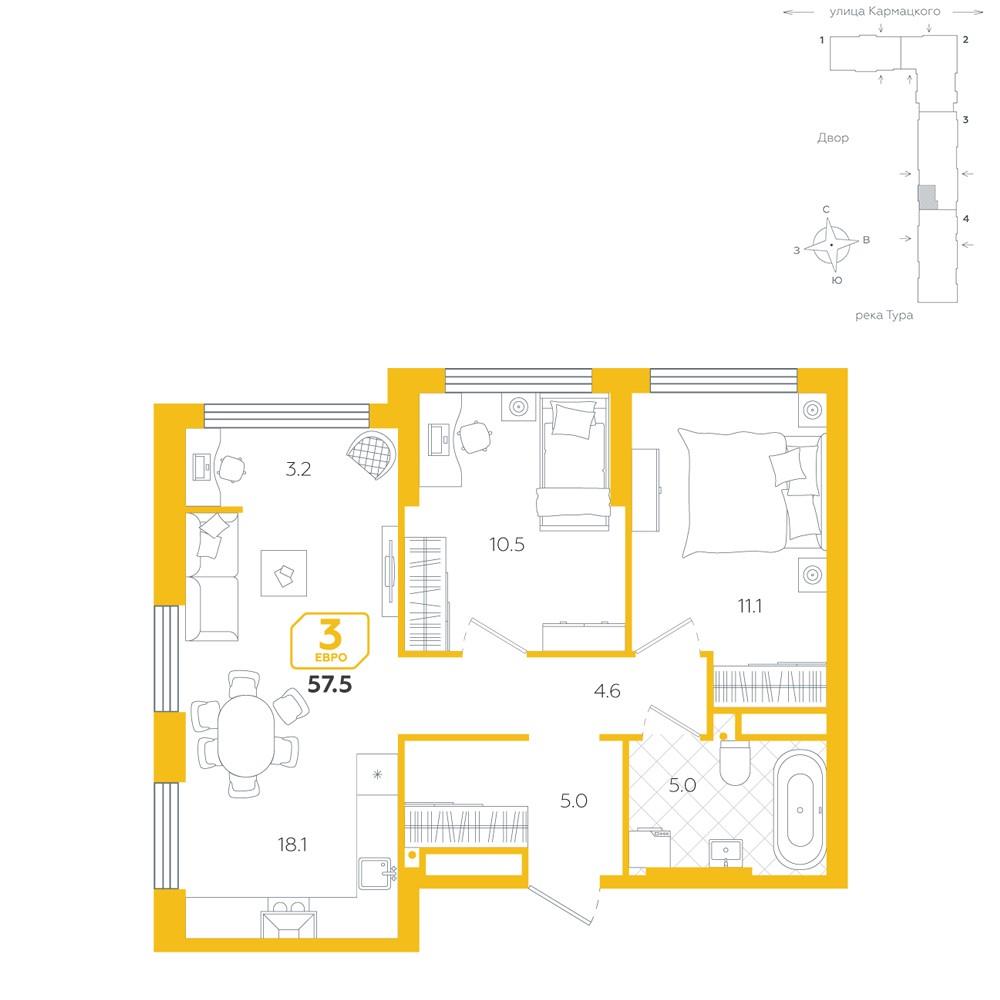 общая 57,5 м2, жилая 21,6 м2, кухни 18,1 м2 |