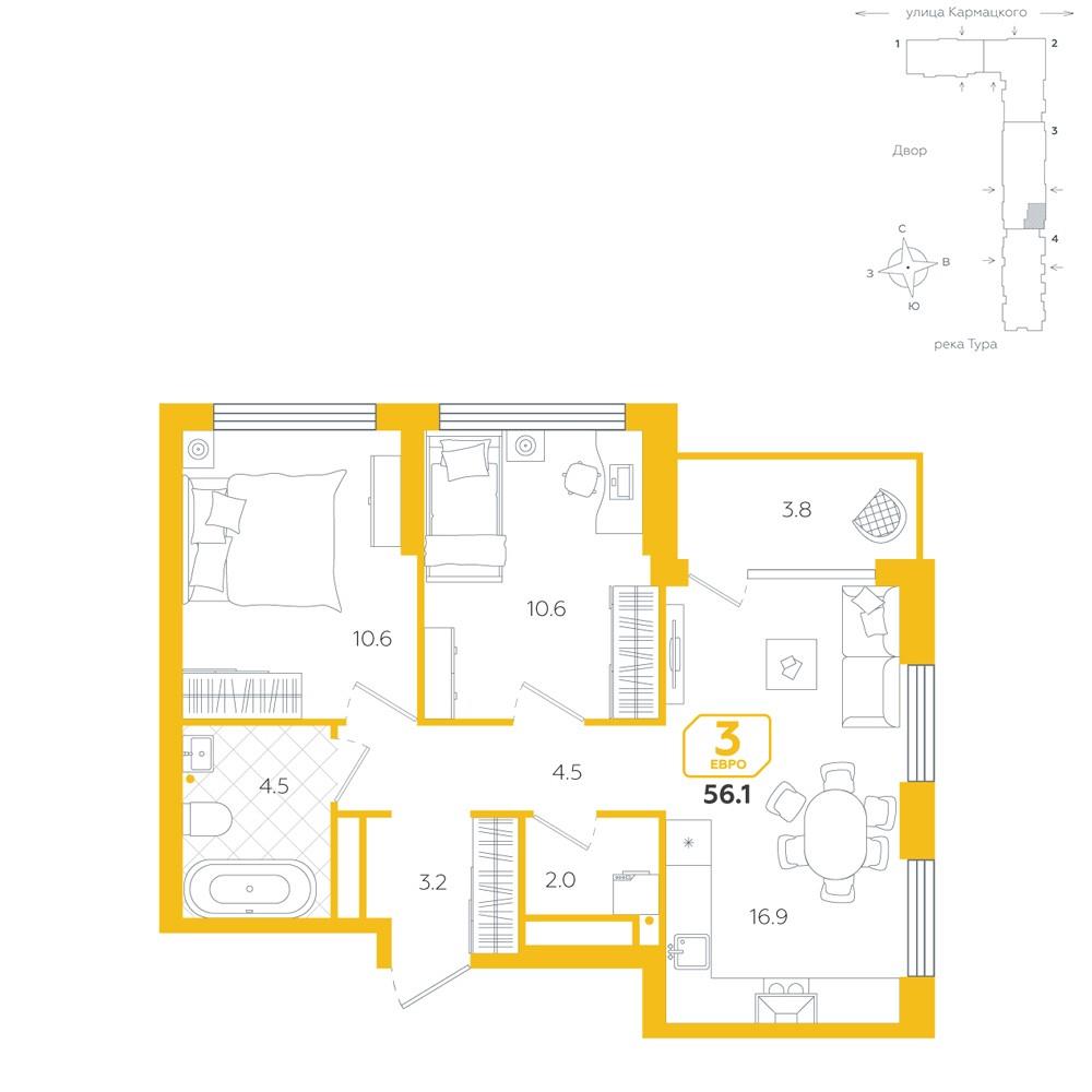 общая 56,1 м2, жилая 21,2 м2, кухни 16,9 м2 |