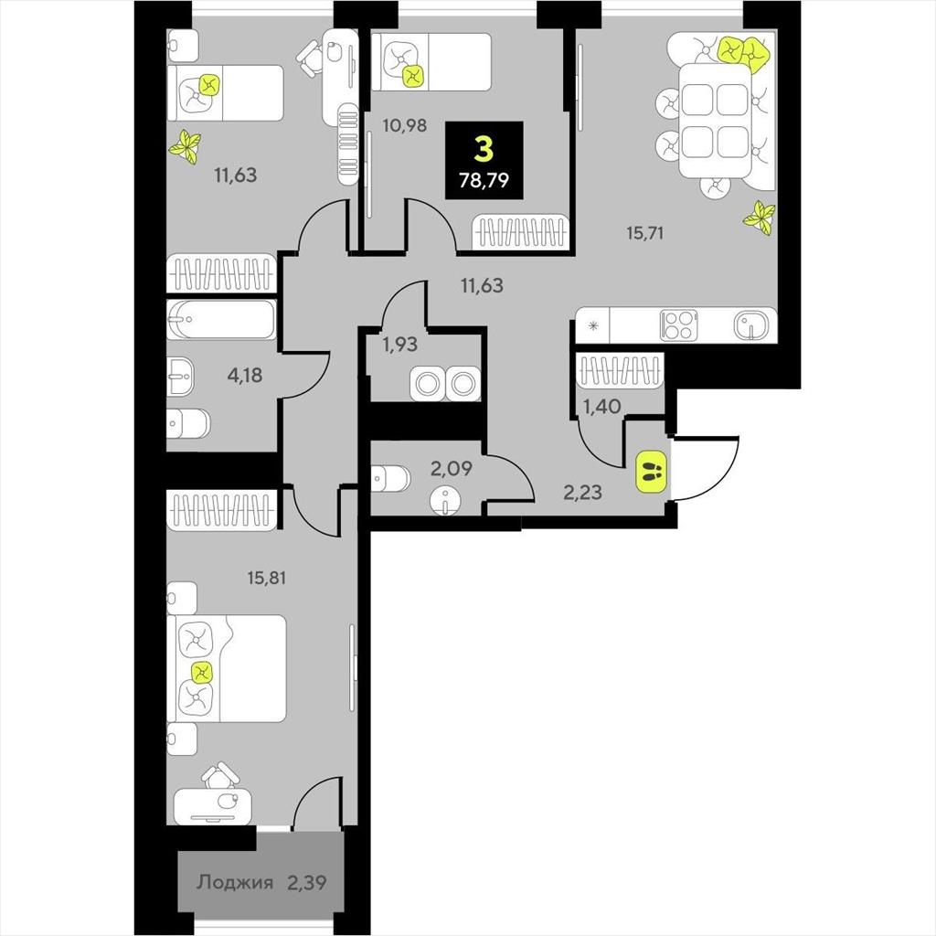 общая 78,79 м2, жилая 38,42 м2, кухни 0 м2 |