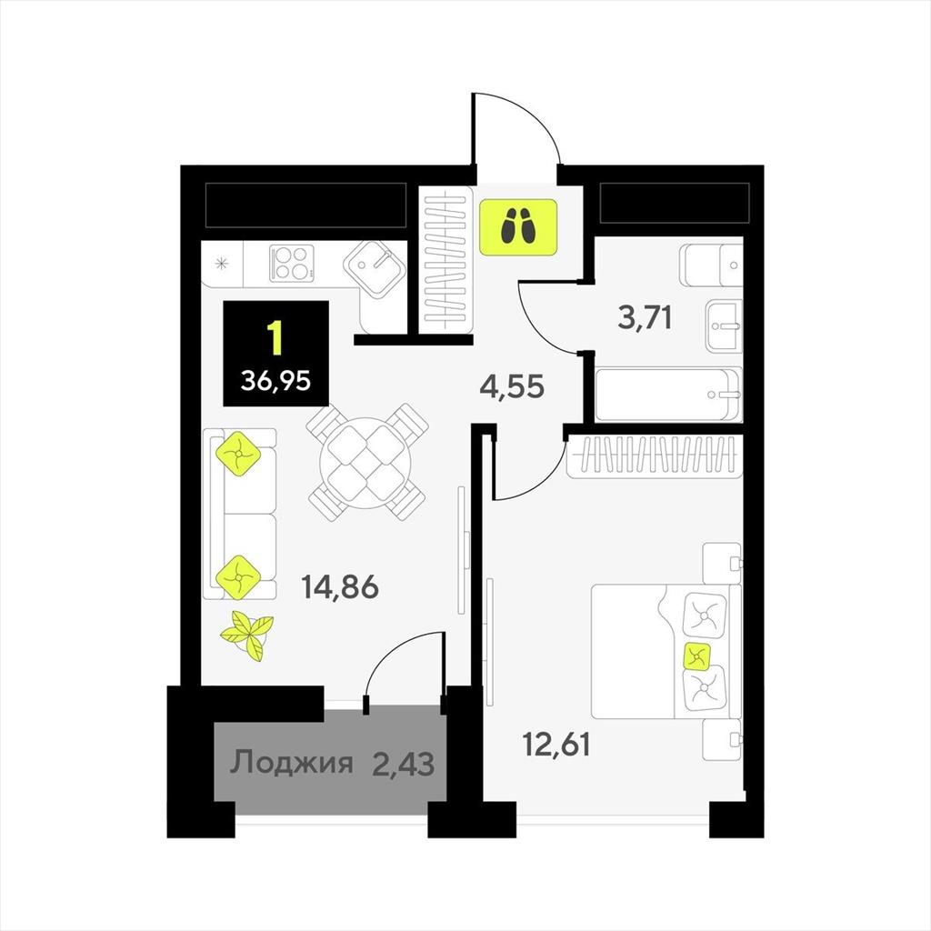общая 36,95 м2, жилая 12,61 м2, кухни 0 м2 |