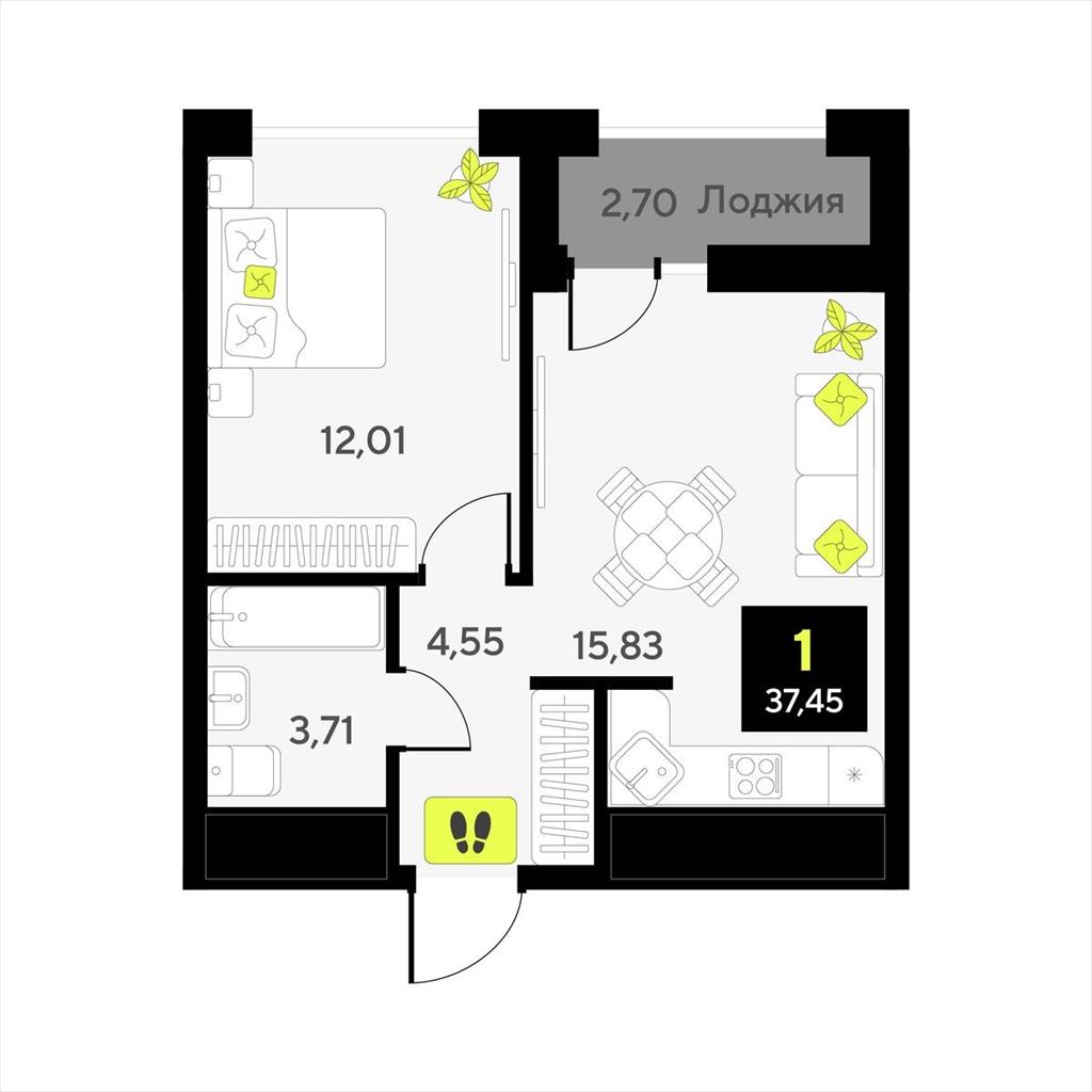 общая 37,45 м2, жилая 12,01 м2, кухни 0 м2 |