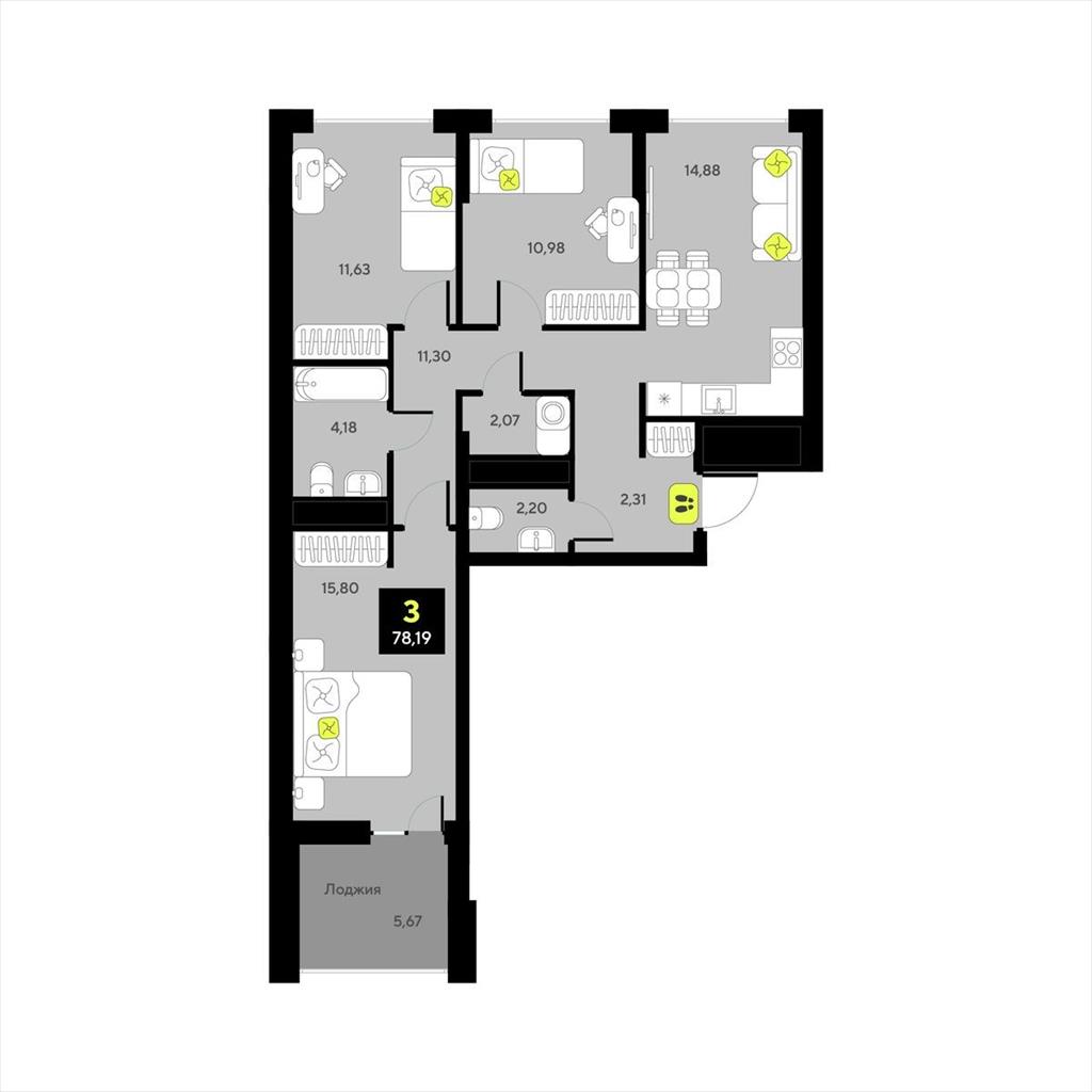 общая 78,19 м2, жилая 38,41 м2, кухни 0 м2 |