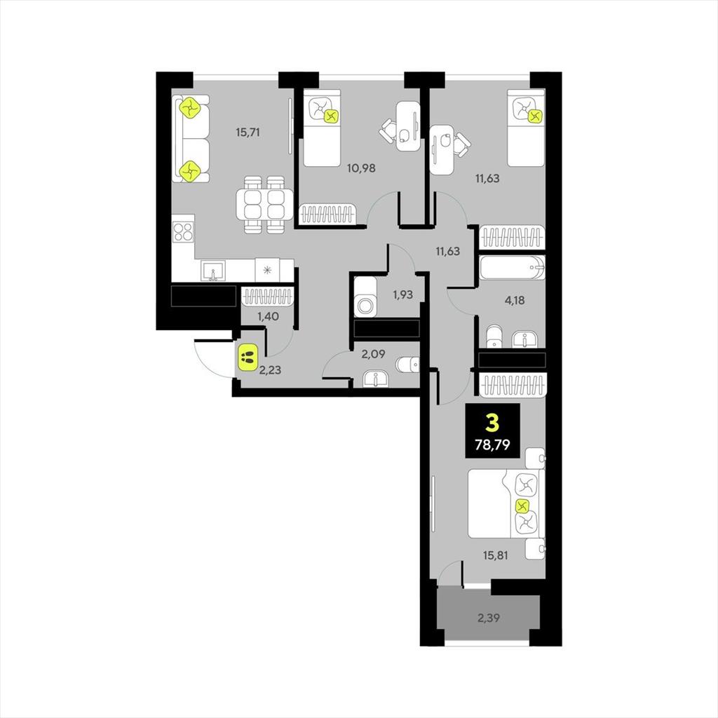 общая 78,79 м2, жилая 38,42 м2, кухни 0 м2 |