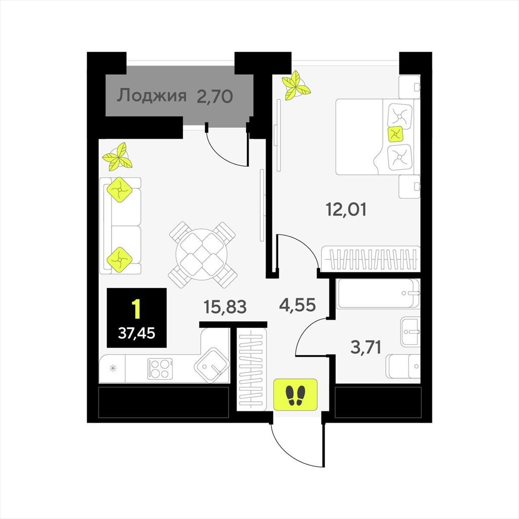 общая 37,45 м2, жилая 12,01 м2, кухни 0 м2 |