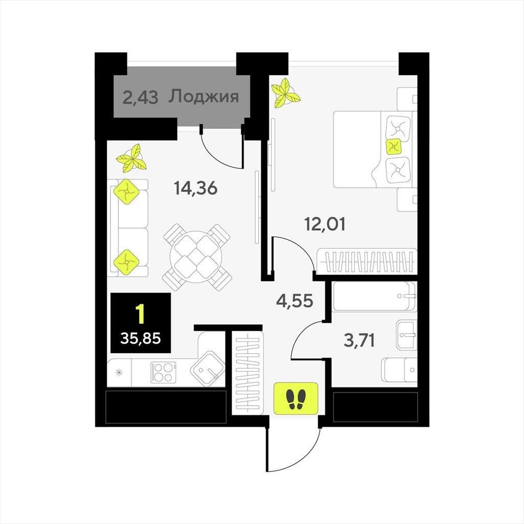 общая 35,85 м2, жилая 12,01 м2, кухни 0 м2 |