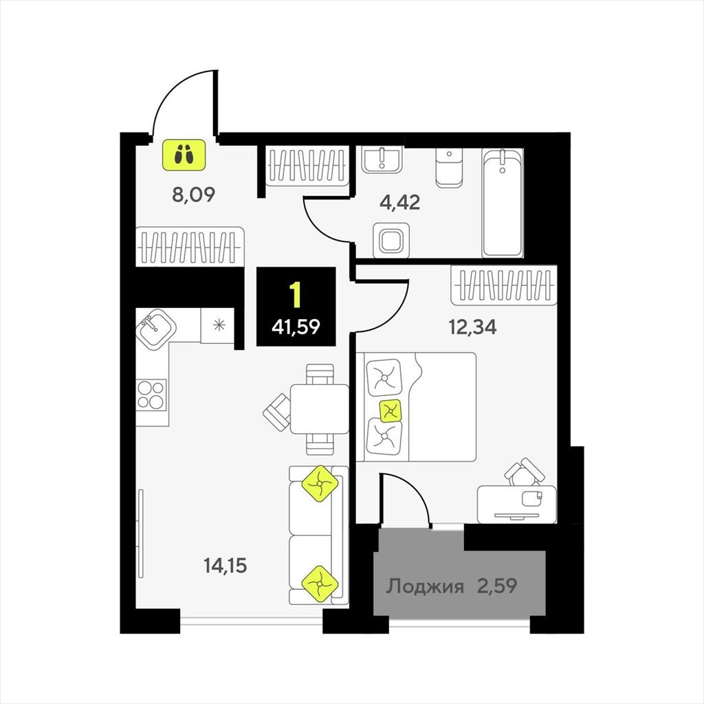 общая 41,59 м2, жилая 12,34 м2, кухни 0 м2 |