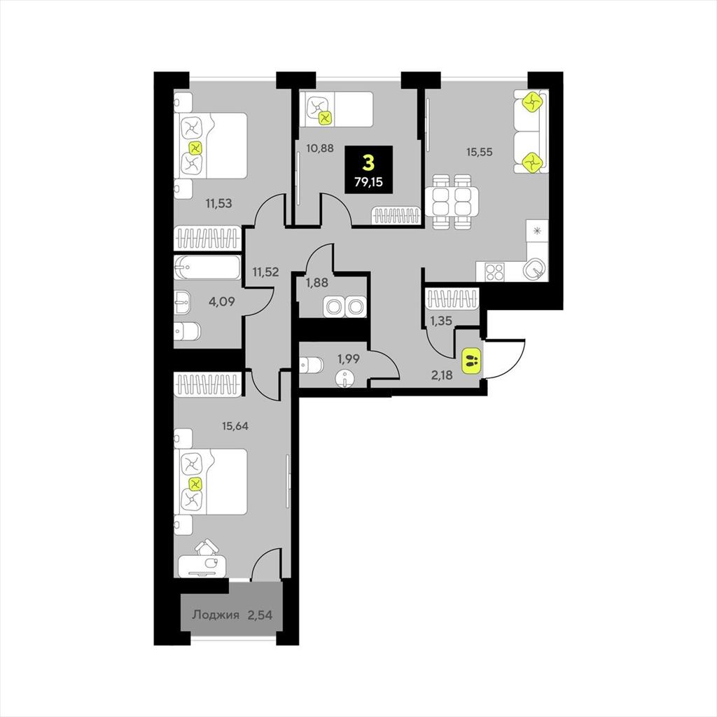 общая 79,15 м2, жилая 38,05 м2, кухни 0 м2 |