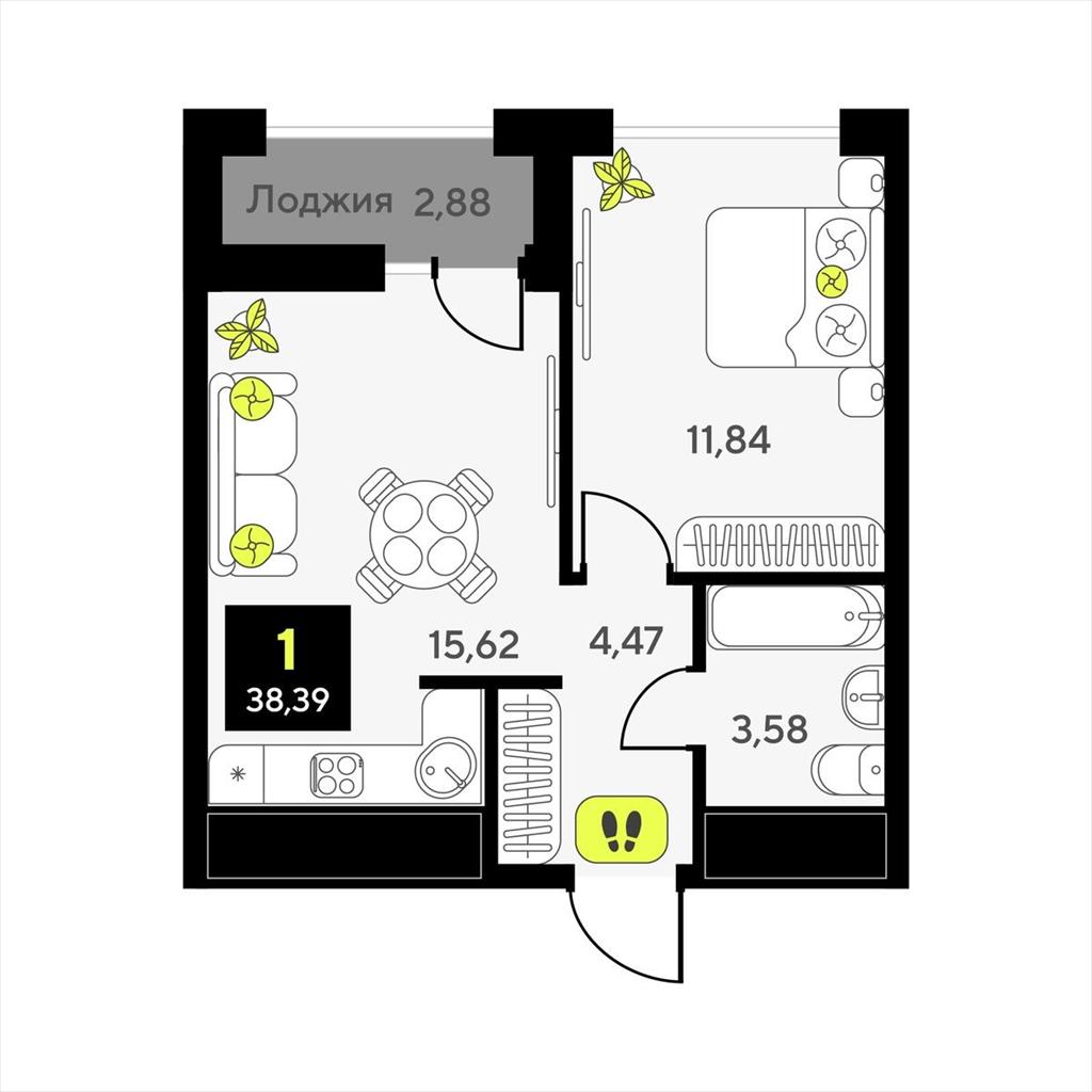 общая 38,39 м2, жилая 11,84 м2, кухни 0 м2 |